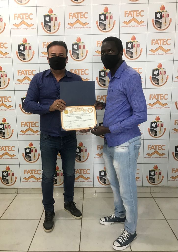 Em maio de 2021, já estamos colhendo os frutos, entregando o primeiro Diploma para o acadêmico DAVIDE ASSALA GOMES, oriundo de Guiné Bissau África Ocidental.